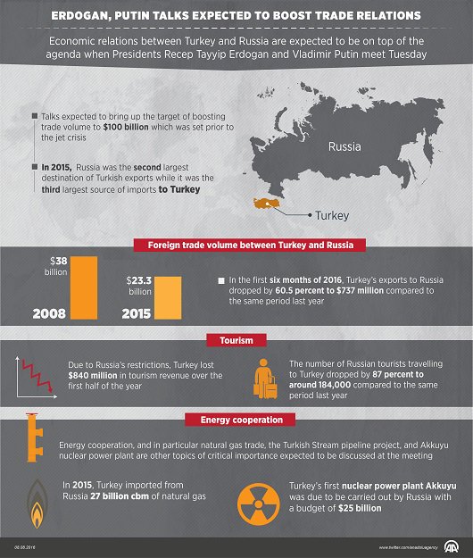 Relations between the two countries began to thaw in late June after Erdogan sent a letter to the Kremlin that was viewed in Moscow as offering an apology for downing Russia’s jet. The letter, quoted by the Kremlin, said Turkey was “ready for any initiatives to relieve the pain and severity of the damage done.” Moscow said it acknowledges that Turkey is serious about restoring closer relations between the two countries. “The Turkish President is coming to St. Petersburg, despite a relatively complicated situation at home,” Ushakov asserted.