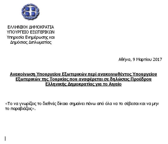 Μετά την ανακοίνωση του τουρκικού Υπουργείου Εξωτερικών που υποστηρίζει πως τα νησιά του Αιγαίου θα πρέπει να είναι αποστρατικοποιημένα και οτι ο ΠτΔ Προκόπης Παυλόπουλος δε γνωρίζει απο Διεθνές Δίκαιο έρχεται και η απάντηση του ΥΠΕΞ.